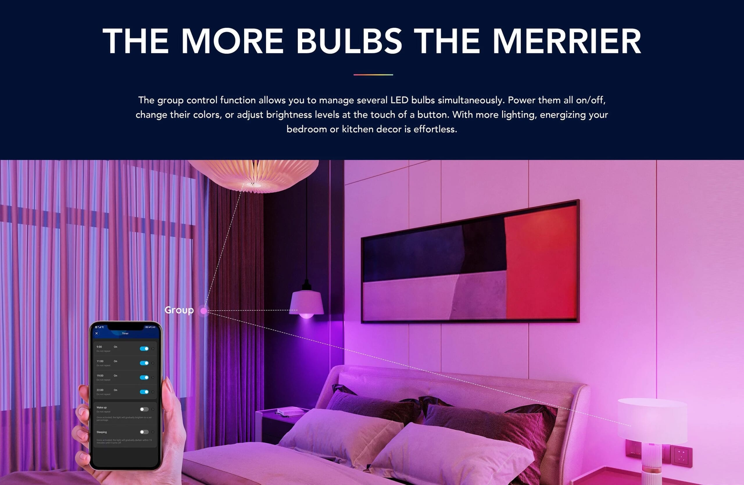 Hãy thắp sáng phòng ngủ, nhà bếp của bạn với Govee Bluetooth LED Bulb. Với bộ hẹn giờ tự động, điều khiển giọng nói thông qua Alexa và Google Assistant cũng như đồng bộ hóa nhóm, bạn có thể dễ dàng quản lý nhiều bóng đèn cùng 1 lúc.