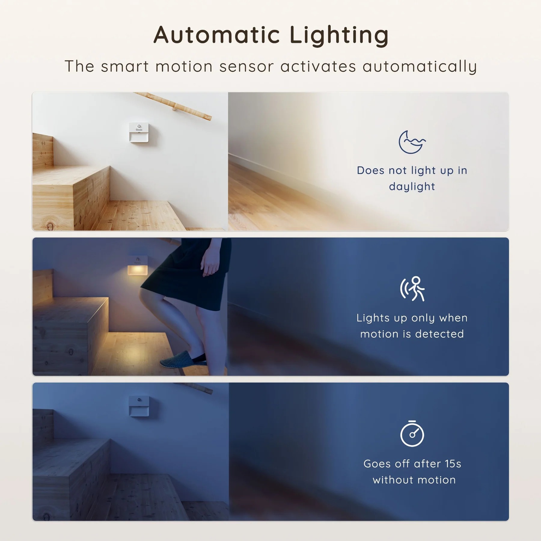 Những đèn ngủ Govee cung cấp ánh sáng hướng xuống, không gây chói mắt khi sử dụng. Cài đặt ở bất cứ đâu và tận hưởng ánh sáng ở bất kì đâu. Ánh sáng góc rộng từ đèn ngủ nhỏ gọn, tiết kiệm năng lượng. Gói 3 cái.