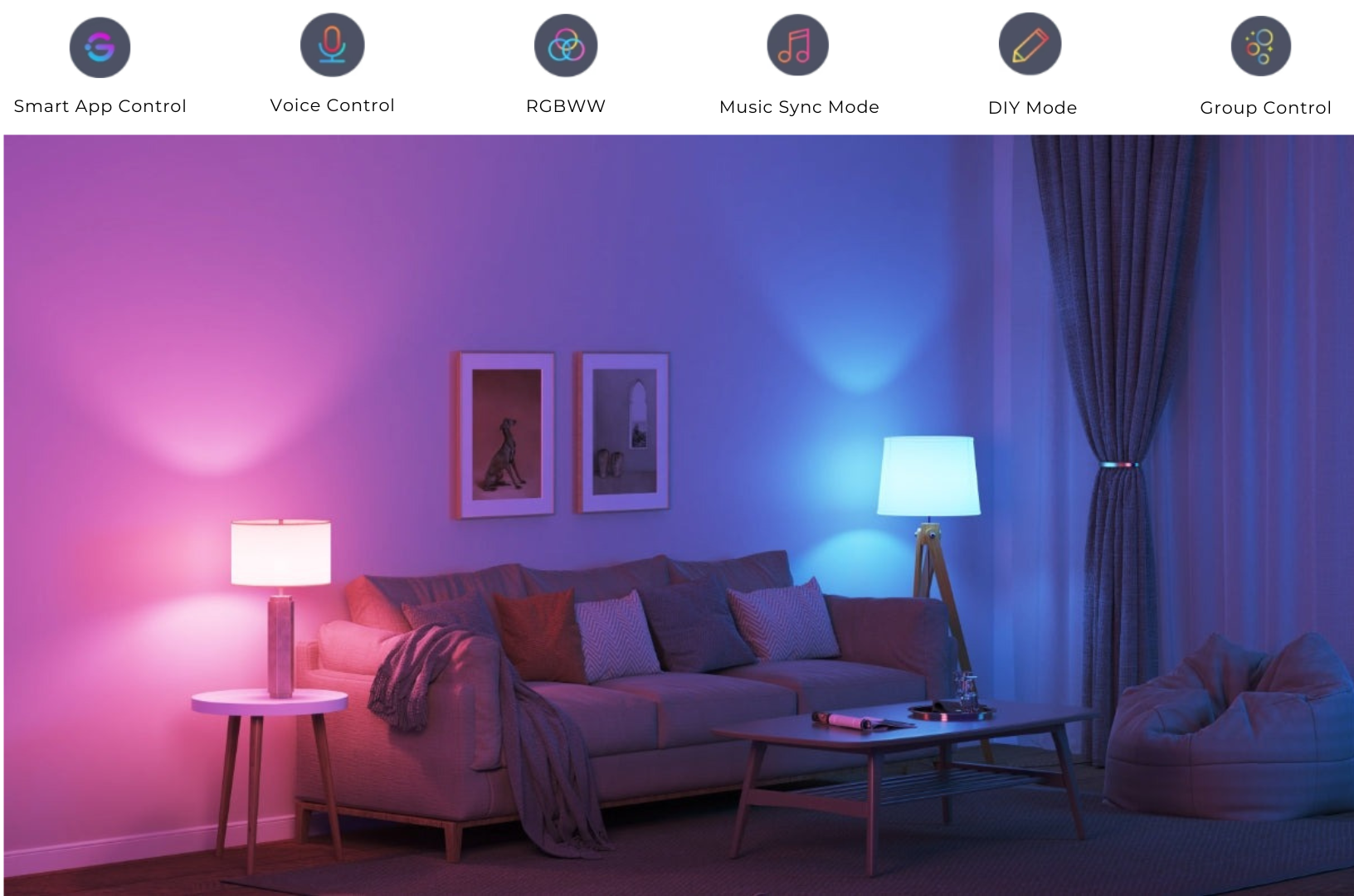 Sử dụng ứng dụng Govee Home để tận dụng Chế độ Đồng bộ Nhạc. Cho dù đó là nhạc pop, rock and roll hay country, mic tích hợp sẽ kết hợp với các bản nhạc yêu thích của bạn và làm sáng không gian của bạn với màu sắc và hiệu ứng sống động. Làm cho bạn bè và gia đình của bạn choáng ngợp với các màn trình diễn ánh sáng tuyệt đẹp.